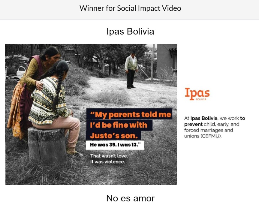 Ipas Bolivia is very happy to celebrate this recognition, which reaffirms the importance of communicating to transform narratives. No es No es Amor tells Carmen’s story and, through her experience, addresses how MUITFs interrupt life projects, perpetuate cycles of inequality and limit the exercise of Sexual and Reproductive Rights (SRHR), while at the same time making visible the work that Ipas Bolivia does to prevent these unions and strengthen the protection of girls and adolescents.