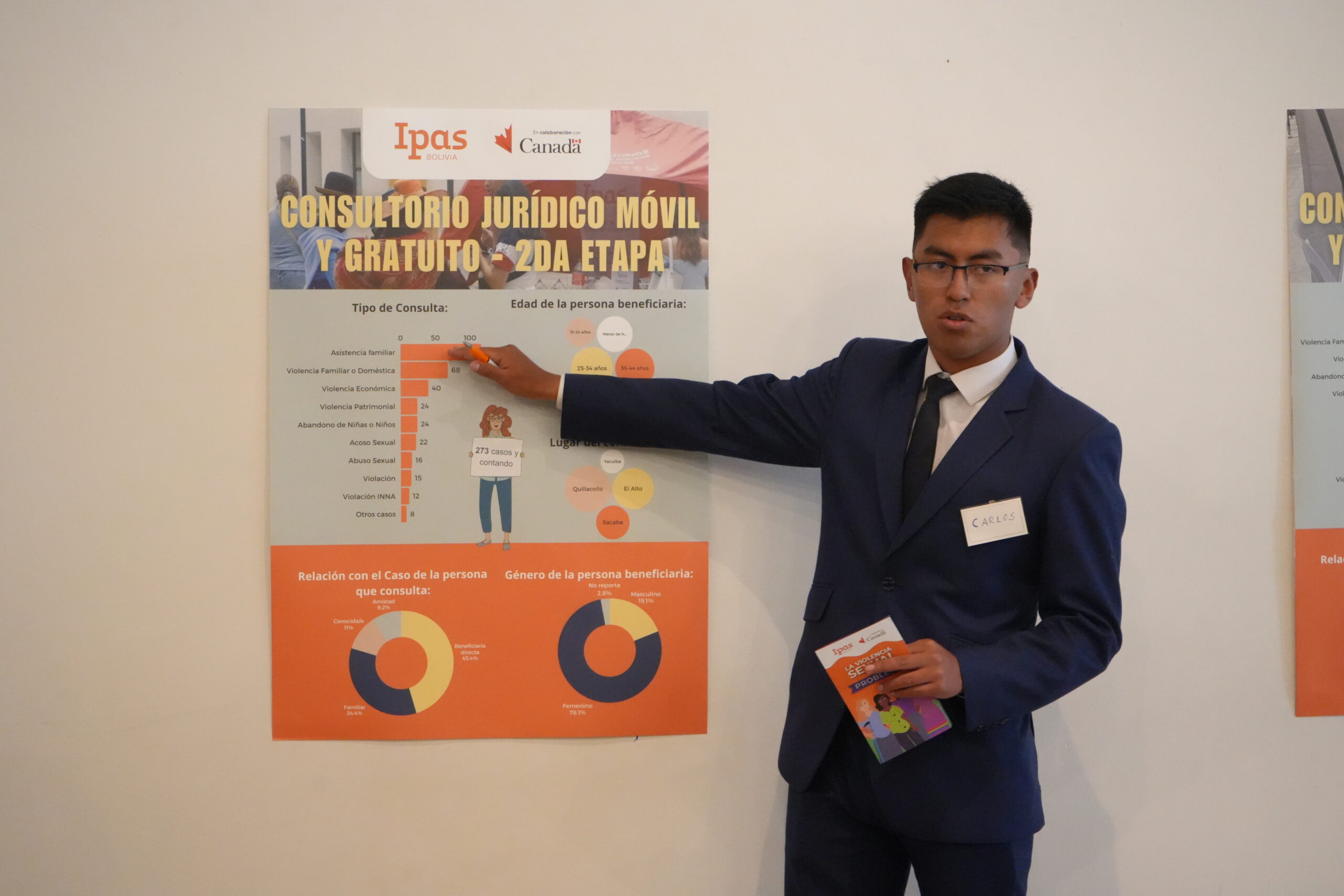 Como parte de los resultados, se implementaron consultorios jurídicos móviles y gratuitos en Yacuiba, El Alto, Sacaba y Quillacollo. La iniciativa brindó atención a 356 personas, documentó 83 casos de violencia basada en género y registró 273 atenciones en una segunda fase, priorizando a mujeres, niñas y adolescentes, con derivaciones a instancias de atención como los Servicios Legales Integrales Municipales (SLIM), las Defensorías de la Niñez y Adolescencia (DNA), la Fiscalía y servicios de salud.